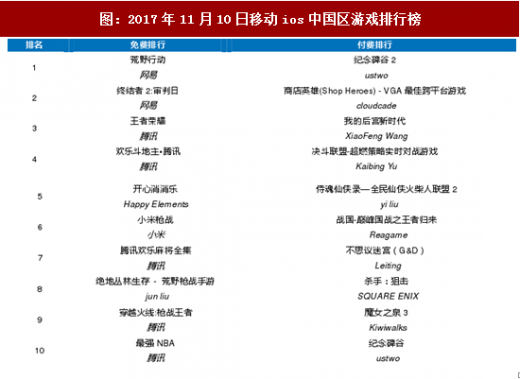截止2017年11月10日,在移动ios中国区免费游戏中,网易的《荒野行劢》和《终结者2:审判日》走红,超过长期霸单第一的腾讯的《王者荣耀》,付费游戏中,独立游戏《纨念碑谷2》霸据首位,排名第一。