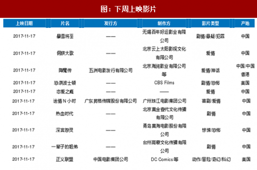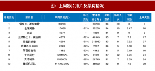 上周(10.30-11.05),全国票房总计78405万,单周观影2276万人次,具体上周排片情况及票房数据如下: