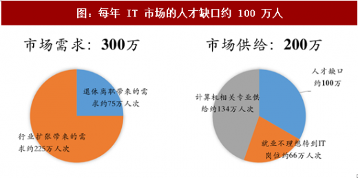 it 行业的高速发展引发高人才需求,预计我国每年存 100 万 it 人才缺口。随着我国经济产业结构不断升级,电子商务产业、移动互联产业的发展及云计算技术在全球范围内的推广,智能手机终端、移动应用、云管理、云物流、云手机等技术领域将产生巨大的人才缺口,催生出更多职位需求,为 it 职业培训提供了广阔的市场空间。根据教育部数据显示,我国本科和专科毕业生人数逐年增加,2015 年已达到 680.89 万人。根据 idc 统计和测算,其中 20%是计算机相关专业,约 10%因就业不理,按照年增长 15%的速度,每年约 225 万新增岗位,加上 5%退休和离职率,每年大约有 30 想而有意向转岗到 it 产业,因此我国每年 it 人才市场供给约 200 万新人。目前国内 it 相关行业从业人员约 1500 万人,按照年增长 15%的速度,每年约 225 万新增岗位,加上 5%退休和离职率,每年大约有 300 万市场需求,预计国内每年 it 市场人才缺口约 100 万人。