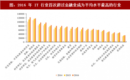 it 行业平均工资较高且增长速度稳定,对人才吸引力大。随着信息技术产业持续快速发展,信息传输、和服务业平均工资得以快速增长。行业内从业人员平均工资近年来维持了稳定增长态势,2014-2016 增长率分别为 10.92%、11.10%、9.31%。薪酬是求职者对目标工作的重要衡量标准之一,it 行业丰厚的薪资待遇和广阔的前景激起大批人才向这一邻域进发的决心。根据国家统计局数据显示,2016 年平均工资为 12,2478 元,比上年增长 9.3%,平均工资水平首次超过金融业排名各行业门类首位。