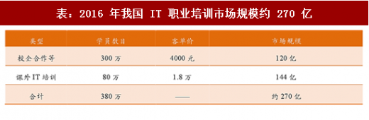 按照我们测算,2016 年 it 培训市场空间约为 270 亿,对应年均复合增长率 15%。其中,接受课外培训的学员约有 80 万人,客单价约为 1.8 万元,对应 144 亿市场规模;校企合作、企业内训的学员总计接近 300 万人,这部分课程周期较短,收费约为 4000 元,对应市场规模 120 亿。