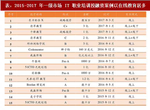 从一级市场的投融资情况来看,it 培训领域的融资数目及融资金额都保持了较高的热度,不乏多项亿元级别以上的融资项目。根据 it 桔子统计,近几年一级市场上 it 职业培训的投融资案例在职业培训领域稳居首位,以在线教育居多,且亿元及以上的投融资案例逐年增加,个别优质企业凭借自身独特的商业模式开始崭露头角。2016 年,蓝鸥科技、邢帅网络学院、易第优、51cto、博览网、翡翠教育、我职场先后获得投资,其中蓝鸥科技、兄弟连、51cto 和翡翠教育对外披露的金额均过亿元,2017 年千峰教育、翡翠教育和东方标准 x 同样获得大笔投资,翡翠教育更是在短短 3 个月内获得 c 轮和 c 轮两轮融资,金额共计 5 亿元。