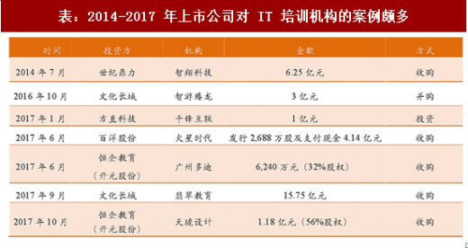 近年来,通过上市公司并购成为 it 培训培训机构登陆资本市场的主流方式。行业龙头达内科技于 2014 年 4 月成功登陆美股,但从行业整体来看,大部分 it 培训机构体量相对有限,通过上市公司并购而登陆资本市场还是主流选择。其中,世纪鼎利以 6.25 亿元收购 it 教育服务提供商上海智翔科技,开启与职业院校共建二级学院(鼎利学院)之路;文化长城以 3 亿元并购智游臻龙,同时在今年 9 月份以 15.75 亿收购翡翠教育 100%股权,配合原先收购的教育信息化平台联汛教育,打造“招生 培训 就业”的完整职业教育产业闭环;方直科技 1 亿元投资千锋互联;开元股份全资子公司恒企教育 6240 万元收购广州多迪 32%股权,同时在今年 10 月份收购泛 it 类培训机构天琥设计,完善自身在大 it 培训领域的布局;百洋股份发行以 2,688 万股及支付现金 4.14 亿元收购火星时代,从“授人以鱼”向“授人以渔”进军。