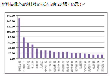 华强方特(834793.oc)市值位居首位:按照 2016 年 12 月 7 日的市值统计,新科技概念板块挂牌企业总市值前 20 强门槛为 14.00 亿元,其中华强方特(834793.oc)以 149.16 亿元的市值位居首位,大幅领先排名第二的九州量子(837638.oc)77.54 亿元的市值。