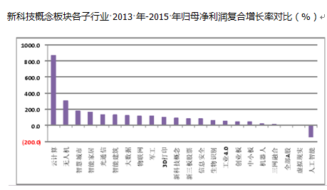 云计算、无人机、智慧城市、智能家居、光通信 2013 年-2015 年归母净利润复合增长率排名前五:对比新科技概念板块各子行业与 a 股市场 2013 年-2015 年归母净利润复合增长率,可以看出,新科技概念板块 2013 年-2015 年归母净利润复合增长率 93.9%高于全部 a 股(7.4%)、中小板(46.2%)、创业板(49.2%)和新三板股票(86.8%)。