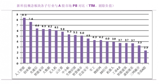 人工智能、光通信、智能家居、大数据和无人机市净率排名前五:对比新科技概念板块各子行业与 a 股市场的市净率,可以看出,新科技概念板块人工智能子行业估值甚至超过了创业板,光通信、智能家居、大数据、无人机、云计算等子行业估值也超过了中小板,新科技概念板块所有子行业估值均超过了全部 a 股。新科技概念板块各子行业市净率排名前五位依次是人工智能、光通信、智能家居、大数据和无人机,其市净率分别为 8.3、6.4、6.3、6.2 和 6.1。