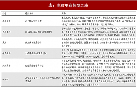 在单一线上模式的风口过后,生鲜电商行业进入洗牌期。据中国电子商务研究中心统计,2016-17 年有 14 家生鲜电商倒闭或者转型,2010 年上线的吉哆生鲜主打鲜食、熟食等生活品,现已转型成医疗相关网站;本来生活旗下本来便利上线不足 1 年面临收缩,并入本来生活网;前身为“正大天地”的美味七七初期发展顺利,最终因资金流问题而暂停营业。