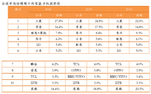 从全球智能手机出货量的品牌市场占有率来看,三星苹果仍稳坐一二名,但国产手机品牌出货量不断增加,增长速度超过全球平均值,并且总量已经接近苹果、三星的 5.47 亿部总和,占据全球市场的半壁江山。根据报告显示,2015 年全球智能手机出货量为 12.93 亿部,同比增长 10.3%,其中国产品牌的增长势头迅猛,占比超过 40%。而出货量排名前十的品牌中,有 7 名来自中国大陆,其余三名则来自韩国和美国。