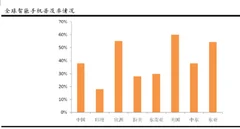 目前,在欧美及日韩等发达地区,智能手机普及率较高,在 50%以上。其中,美国智能手机1.9 亿部,智能手机普及率 77%左右,苹果作为美国最大的手机品牌,占据 41.3%的市场份额,三星作为安卓系统领头羊占据 27%份额。欧洲截止至 2015 年,智能手机使用率达 55%,尽管苹果占据英国将近一半的市场,但黑莓手机在英国使用占比第三,说明欧洲人对手机不追求更新换代。
