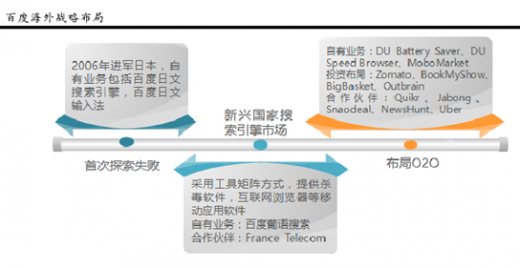 百度最初一心专注于核心业务,近年来借助全球发展时机,全面加速全球化战略。早在 2006年年末,百度进军日本搜索引擎市场,由于文化壁垒等因素,经过 10 年的尝试与探索最终以失败告终,退出日本市场,百度的首次国际化战略启发其进入新兴市场。2013 年,百度通过工具矩阵出海的方式,叠加资本投资,进军人口众多,移动互联网时代处于开始增长到爆发的巴西,印度等新兴市场国家。在巴西市场中,百度通过自己的技术和产品为其提供优质的互联网服务,提出互联网科技业务研发创新性金沙下载送彩金的解决方案,还将提供包括杀毒软件和互联网浏览器在内的移动应用软件,目前 hao123 桌面端用户突破 3000 万,百度卫士用户也超过千万,2014 年,百度葡语版搜索在巴西正式上线。2015 年,百度加速国际化战略,在 o2o 领域重点拓展,将 o2o 经验、技术、产品移植到新兴市场。在印度市场,百度已经与当地电商平台 flipkart、snapdeal,印度版 58 同城quikr 等企业建立了白菜网送体验金无需申请的合作伙伴关系,逐步渗透到垂直类 o2o 领域。