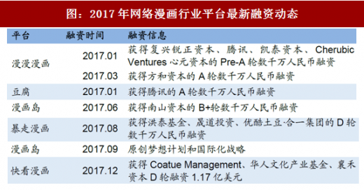 在泛娱乐浪潮下,资本助力,ip金沙下载送彩金的版权衍生开发将成为漫画行业增长的又一大动力。漫画巧妙结合多种形态文化特征,打造出不同形式的文化产品,资本的快速涌入在加速内容生产的同时,也促进了漫画内容与现有ip产业链的融合,从而延长漫画产业链。截止2017年10月,漫画平台的融资大多已进入b轮及c轮的中后期阶段。从目前来看。漫画延伸主要有三大方面:(1)影视作品,即改编成或,如《十万个冷笑话》等;(2)动画,漫画和动画表现形式最为接近,所以漫改一般首先从改编为动画开始,如腾讯动漫的《一人之下》、《狐妖小红娘》;(3)游戏,如《尸兄》、《血族》等。