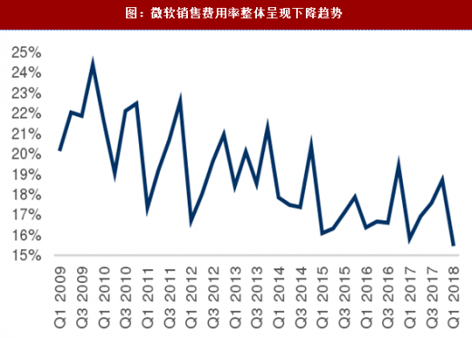 季度回归下云计算各项业务增速仍然强劲,office订阅收入高增42018财年第1财季,包括office365等服务的productivityandbusinessprocesses部门季度营收82.4亿美元,同比上涨28%。其中office365的单季营收同比增长了42,订阅用户从上一季度的2700万增加到了2800万。office云化的成功不仅体现在收入和用户增长上,销售费用的控制目前看整体也呈现下降的趋势。