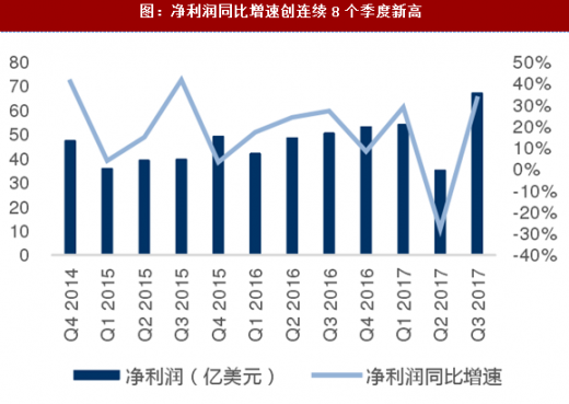 从芯片到终端,谷歌进一步将ai技术与业务结合。本季度谷歌以11亿美元收购htc并推出pixel2手机扩充ai生态圈,目前谷歌在人工智能的布局已经从技术到软件到硬件打通了了全产业链条。从包括日ome音响、pixel手机在内的硬件也可以为谷歌提供更多数据,帮助公司尝试ai与广告业务的协同效应。芯片方面第二代丁pu,峰值性能达到180tflops/s,且用户能通过专i7的网络,在云端利用丁pu构建机器学习的超级计算机,对谷歌云来说不失为一种竞争力的补充。此外,鉴于丁pu的性能和功耗优势,我们看好未来tpu在云数据中心的大量应用。