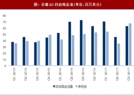 现金流充裕,q3期末现金及有价证券总额947亿美元。q3资本支出继续扩大至35.4亿,同比增长39%,环比增长25%,主要为谷歌部门研发费用,otherbets资本支出有所控制为0.77亿美元。经营性现金流为98亿美元,大幅高于当期67亿美元的净利润。过去六个季度自由现金流连续高于当期净利润,本季度自由现金流为63亿美元。尽管目前谷歌仍然过于依赖广告业务,但充裕现金流有助于公司持续新业务的投资。