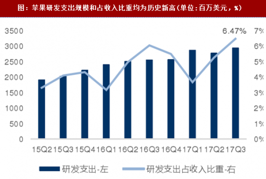 研发支出继续保持高增,进入下一研发周期。fy17q3苹果的研发支出达到了29.37亿美元,为历史最高值,同时占收入的比重达到6.47%,也是历史最高值,这意味着苹果开始了新一轮的研发周期。除了现有产品的微创新外,苹果新推出的ar平台也是值得关注的重点,arkit或成为最大的ar平台。目前,苹果最新的笔记本机型已经能够支持vr,且公司研发方面已经引入steamvr程序开发包。ar可能成为苹果下一个增长点,反过来,苹果的ar布局也可能推动虚拟现实的普及和新一轮投资高潮。