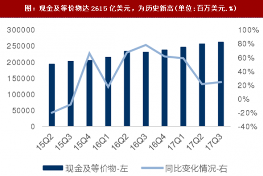 苹果账面现金及其等价物为2615亿美元,为历史最高值,转型期收购预期强烈。过去几年,苹果公司相对于其他几个科技股巨头(fb220亿美元收购whatsapp,微软262亿美元收购linkedln,谷歌125亿美元收购motorola),现金持有量最多,但是大型并购最少。历数苹果近两年的并购历程,标的主要集中在现有产品的微创新领域。考虑到智能手机的销量天花板,苹果未来的借助并购,助力自身完成转型的可能性极高。按照苹果不轻易做并购的传统,未来公司重大的并购都是值得关注的方向。