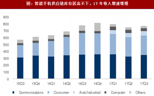 智能手机供应链库存居高不下,拖累公司2q17-3q17收入增长。2q17中芯国际下游客户领域包括通讯(communications)、消费者(consumer)、电脑(computer)、汽车/工业(auto/industrial)和其他(others),其中3q17通讯和消费者的收入贡献分别为45.3%,37.0%。公司认为1q17智能手机供应链渠道库存和上游fabless库存建立过高,是导致公司营运动力不强的主要原因,这个观点和台积电、日月光一致。