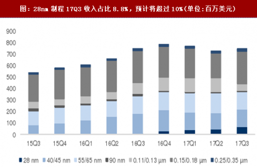 公司28nmhigh-k制程自2q17风险试产,预计日igh-kplus将于2018年底投入生产,3q178寸指纹识别、norflash表现良好。3q17公司28nm制程收入占比约8.8%,公司预计28nm制程收入将超过10%,但我们认为,考虑到台积电、联电28nm制程产品asp的竞争压力,28nm制程难以拉动中芯国际整体收入明显增长。3q17公司产品指纹识别ic,norflash和电源管理ic表现突出,带来短期营运动力。