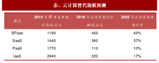 开支正快速转向云计算。2016年云替代的总规模预计达到了1110亿美元,到2020年将增加到2160亿美元。未来五年向云的转移将会直接或者间接影响超过1万亿美元it开支,占整体it开支的重要份额。云计算正在快速替代传统it开支,成为自数字化时代以来最有破坏性的力量之一。