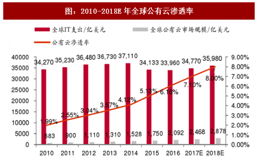 全球公有云渗透率快速提升。全球公有云计算市场规模占总共全球it支出的比重快速提升,从2010年的1.99%上升到2016年的6.16%,预计到2018年将达到8%。云计算的渗透率快速提升在全球范围内得到佐证。