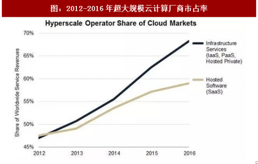 行业的“马太效应”明显。前24家超大规模运营商(通常拥有数十万台服务器,例如亚马逊和谷歌)拥有近320个大型数据中心,2016年占全球云服务市场的68%(包括iaas、paas和私人托管云服务),占saas市场的59%,而在2012年这两项数据仅为47%左右。超大规模运营商的主要云服务市场份额逐年增长,行业集中度不断提高,反映出明显的马太效应。