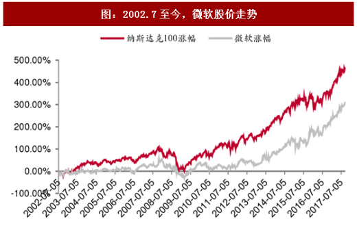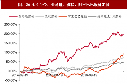 海外云计算巨头股价走势强劲。2014年9月19日至今,亚马逊、微软、阿里巴巴这三家全球云计算巨头股价屡创新高,市场认可全球it投资逐渐云化的趋势以及云转型公司未来业绩增长的确定性。亚马逊股价涨幅是同期纳斯达克100指数的2.4倍,尽管公司市盈率维持高位,亚马逊首席执行官jeff bezos执行的“重现金流创造能力而轻利润”的战略已被市场接受,而aws云业务就是公司“造血能力”非常重要的来源,如在2017q2扣除aws贡献的营业利润,当期公司整体营业利润为负。2014年阿里巴巴美国上市后股价曾一度腰斩,随着2015年阿里云逐步贡献收入并连续实现翻倍增长、拿下国内将近一半市场,公司股价开始一路飙升。微软公司股价自2002年到2012年近十年间表现低迷,期间公司的战略布局欠佳、业务表现平庸,自从2014年新任ceo satya nadella提出“cloud first”战略、各业务线全面云转型,股价屡创新高。