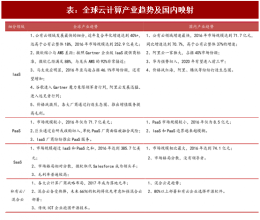 2017年全球云计算行业及领军公司发生诸多变化,在公有云领域(iaas/paas/saas)和混合云领域均出现验证,整个产业发展趋势变得更为明晰,部分趋势在国内得到映射。如下表: