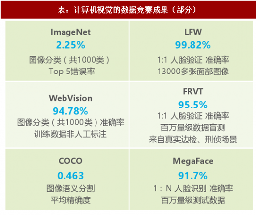 2007年由李飞飞教授发起的image net计划将领域的影像数据推向了前所未有的规模,至今已有1400万张经过人工清洗标注的图片,含有2万个分类,为计算机视觉领域做出巨大贡献。自2010年每年一度的image net物体识别竞赛(对1000类接近50万张图片的单标签识别),更是成为了视觉领域最受关注的比赛。2017年,image net举行了最后一届图像分类竞赛,top 5的错误率降至2.25%(大幅领先人眼),该竞赛完成了历史使命,而更多的关于图像语义分割(像素级的分类问题)、1:n人脸识别、图像及视频理解(看图写话)方向的数据集与比赛将逐步登上舞台,推动更多领域更贴近真实世界场景的算法革新。