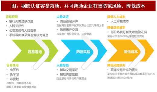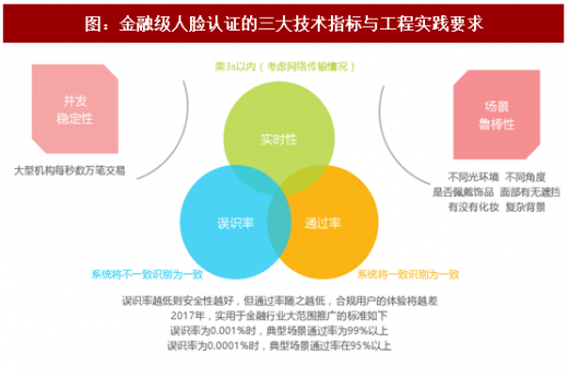 与影像分析中人脸的“1:n”识别不同,目前泛金融领域以人脸“1:1”身份认证为主,部分场景涉及“1:n”识别,如银行网点中对vip客户的智能识别。