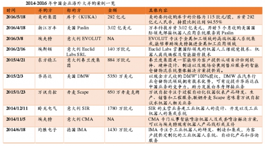 在信息技术革命推动的制造业转型升级趋势下,全球工业 4.0 并购浪潮涌动,未来无论是机器人、数控机床、自动化生产线、数字工厂,还是传感器、智能测量仪表、工业控制系统、伺服电机等智能核心装置,需求都将成倍增长,市场规模广阔。同时,在技术为王的智能制造领域,收并购国内外具有自主知识产权、较强的研发团队以及领先的市场地位的相关企业逐渐也成为国内企业快速提升规模、提升核心竞争力、快速完成国际化经营布局的重要途径,也是实现融合式发展、产业快速转型升级和结构调整的便捷之路。一方面可以直接获得大量专利,另一方面是可以获得具有研发实力的团队。当下海外优质标的掌握着高端制造的核心技术,先发优势明显。在市场和技术共同驱动下,中国企业掀起了一阵工业 4.0 海外并购热潮。根据数据显示, 其中 2015 年我国工业 4.0 海外并购金额达 858.8 亿元,年增长率达 805.8%,相较 2014 年并购金额大幅上升,案例数量也从 42 例增加到 71 例,增长 69.05%。在 2015 年 5 月我国出台《中国制造 2025》之后第三季度单季并购金额达 684.54 亿元,环比增长 21.97% 。