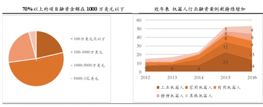 根据 cbinsight 的数据显示,全球工业机器人创投融资天使轮融资占所有轮次项目比例高达 42%,紧接其后的是 a 轮融资占 14%,两轮融资项目加起来接近 60%,后续融资 b 轮、c 轮、d 轮、e 轮分别占比 8%、9%、6%。由因果树的数据可看出,国内机器人行业创投融资与全球保持一致,大多数融资案例仍集中于前期轮次,其中在 2016 年的全部融资案例中天使轮和 a 轮占比分别达到了 22.9%、54.3%, b 轮融资只占了 22.9%,c 轮与 d 轮融资案例数量均为 0。我国机器人行业大多数企业还处于技术研发的阶段,发展还不成熟。智能制造仍然是未来 5-10 年制造业转型升级的大方向,机器人行业潜藏极大投资机会,预期未来资本会持续涌入。