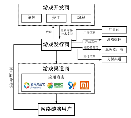 游戏开发商处于产业链最上游,通过挖掘市场的需要,拟订游戏开发项目,编程、美工、内外部多轮测试等流程完成网络游戏的开发,然后向市场发行游戏。游戏发行商负责提供网络游戏的运营平台,是游戏价值实现的重要环节,在网站上为客户提供游戏的链接,并负责对游戏进行推广、运营维护及客户服务等。游戏渠道商是连接游戏运营商和用户之间的桥梁,主要包括一些移动应用商店或门户网站。游戏渠道商凭借强大的用户基础和平台优势,在游戏的推广起到重要的作用。