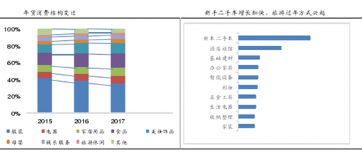 从消费的内容来看,消费升级的趋势非常明显。传统消费品类中,服装消费占比正逐年下降,食品、美妆饰品、母婴、旅游休闲等体现生活品质的品类近三年的占比明显提升。此外,汽车、基建材料、家具等大物件也成为线上增长迅猛的年货商品。