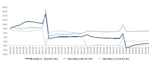 2016年1-9月,重点流通企业分业态增速情况: 超市类公司收入累计同比增长6.80%;专业店公司收入累计同比增长2.50%;百货类公司收入累计同比仅增长1%。