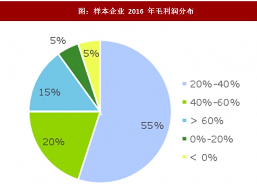 盈利情况:90%的 20 强企业 2016 年的毛利率超过 20%。其中 55%的企业的毛利率在 20%-40%之间,20%的企业毛利率在 40%-60%,15%的企业毛利率超过了 60%。