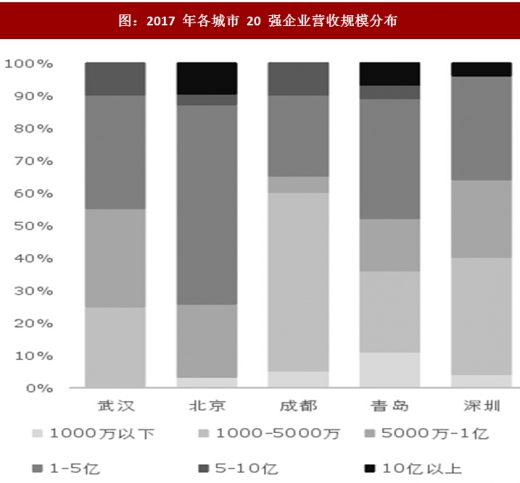 规模方面,本次入选光谷 20 强企业的营收规模在各城市中处于平均水平,而且入选企业的营业收入相对比较接近,没有出现营收在 1000 万以下或者营收超过 10 亿的企业,说明武汉高新技术企业发展相对较均衡。