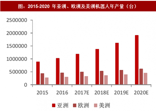 目前全球正在使用的工业机器人已经超过 150 万台,到 2018 年,这一数据预计将突破 230万台,其中 140万台在亚洲。亚洲是全球工业机器人近几年及未来增长的主要驱动因素,世界机器人联盟(ifr)预测,到 2020 年亚洲机器人产量将达到 190 万台,其中中国机器人年产量将达到 95 万台,中国在世界工业机器人产量占比将达到 40%。据 ifr 统计,自 2013 年以来,中国已连续五年成为全球第一大机器人消费国。
