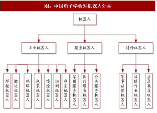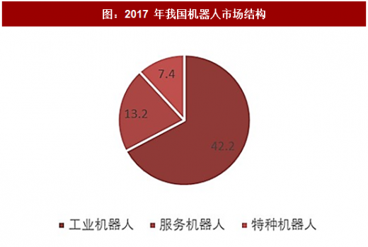 由于我国在应对自然灾害、军事消防和公共安全事件中,对特种机器人有有着突出的需求,中国电子学会将机器人分为工业机器人、服务机器人和特种机器人。工业机器人是面向工业领域的多关节机械手或多自由度的机器装置,在工业生产加工过程中通过自动控制来代替人类执行某些单调、频繁、重复的长时间作业,主要应用于焊接、搬运、码垛、包装、喷涂、切割、净室等领域。服务机器人指在非结构环境下为人类提供必要服务于的多种高技术集成的先进机器人,主要包括家用服务机器人、服务机器人和公共服务机器人,其中公共服务机器人指代在农业、物流、金融、教育等除医学领域外的公共场合为人类提供服务的机器人。特种机器人指代替人类从事高位环境和特殊工况的机器人,主要包括军事机器人、极限作业机器人及应急救援机器人。2017 年,预计我国机器人市场规模将达到 62.8 亿美元, 2012-2017 年 cagr 达到 28%,其中,工业机器人 42.2 亿美元,服务机器人 13.2 亿美元,特种机器人 7.4 亿美元。
