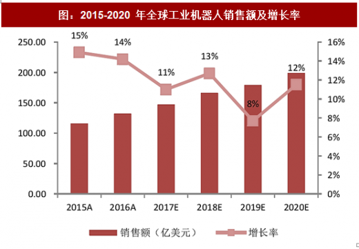 据 ifr 统计显示,2016 年全球工业机器人销售额突破 132 亿美元,其中亚洲销售额 76 亿美元,欧洲销售额 26.4 亿美元,北美地区销售额达到 17.9 亿美元。中国、韩国、日本、美国和德国销售额总计占到了全球销售的 3/4。到 2020 年,全球工业销售额有望突破 199 亿美元,其中亚洲将是最大的销售市场。