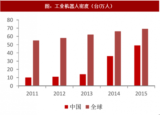 我国工业机器人密度显著低于全球平均水平。截止 2015 年,我国每万人拥有工业机器人的数量为 49 台,仍显著低于全球每万人 69 台。2013 年工信部下发《关于推进工业机器人产业发展的指导意见》,提出到 2020 年机器人密度达到每万人 100 台,由此判断,国内工业机器人本体市场具有广阔增长空间。