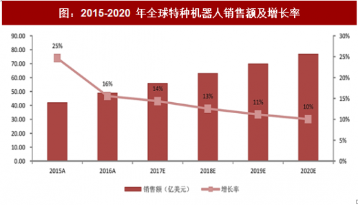 ifr 预测,2017 年,全球特种机器人市场规模将达到 56 亿美元,至 2020 年,预计全球特种机器人市场规模将达 77 亿美元,2016-2020 年年均增速 12%。