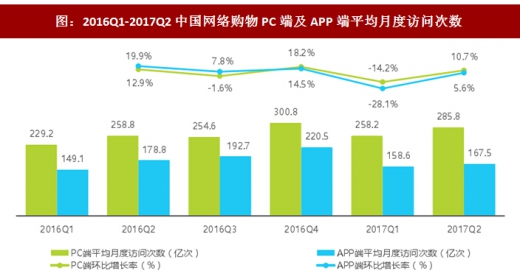 2016年q1-2017年q2,中国网购用户访问pc端的次数持续高于app端,更多的消费者选择在pc端浏览商品。2017年q2,pc端流量环比上升10.7%,app端流量环比上升5.6%。2017年q2,各大电商平台纷纷参与到“618”年中购物节促销大军中,推出形式多样的活动,拉动消费者购物热情,pc端与移动端流量均明显上升。