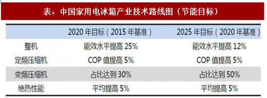 根据中国家用电器协会2015年版《中国家用电冰箱产业技术路线图》提出的目标:1、冰箱整机:能效水平2020年较2015年提高25%,2025年较2020年再提高12%;2、冰箱压缩机:2020年定频压缩机cop值较2015年提高5%,发频压缩机使用占比达到30%;2025年定频压缩机cop值较2020年提高5%,发频压缩机使用占比达到50%;3、绝热性能:2020年冰箱的绝热性能较2015年水平平均提高5%,2025年较2020年再提高5%。