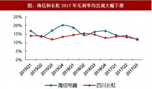 面板的涨价直接导致了海信和长虹自17q1起毛利率双双出现较大幅度下滑。