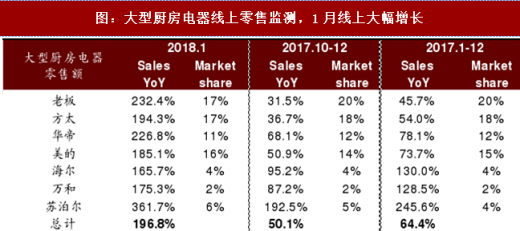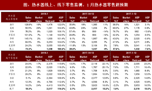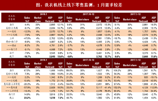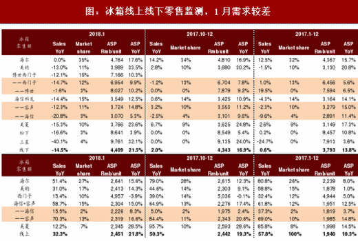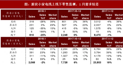 1月空调、热水器零售超预期,大型厨房电器增长较好。冰箱、洗衣机、厨房小家电以及环境清洁类产品需求较弱。