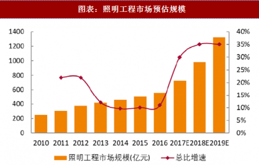 政府主导的城市景观照明工程一般要结合城市自身自然禀赋及城市建设总体规划,统筹布局,这就使得单个项目的规模较以往大幅提升。据名家汇招股说明书披露的数据,公司 2010 年完成的代表性项目合同额仅为 3723 万元,至 2015 年已增至 7800 万元。而近期公司新签订的照明工程施工合同,单合同额已达 2~3 亿元,相关框架协议更是高达 30 亿元。单合同额持续增长也导致照明工程行业市场规模的快速增长。据“高工led产业研究所”(ggii) 的数据,2017~2019 年景观照明工程市场平均增速将达到 33.31%,市场规模分别为 725、979 和 1322 亿元,是建筑工程细分子行业中为数不多的保持较高增速的增量行业。