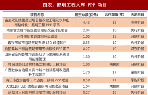 根据财政部 ppp 项目库,已有 11 个关于照明工程的项目入库,对比“全国 ppp 综合信息平台项目库第 8 期季报”,项目数量占比 0.077%;总投资额 22.18 亿元,占比 0.022%。在 11 个入库项目中,进入执行阶段的项目有 4 个,落地率达 36.36%,略高于 35.2%的平均落地率。目前部分企业已提前布局,未来或受益照明工程 ppp 项目大量落地的红利,业绩增长潜力巨大。