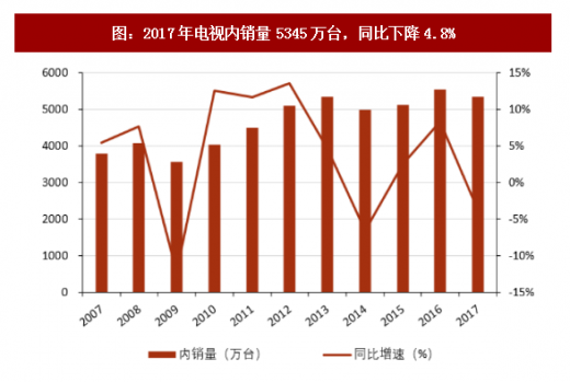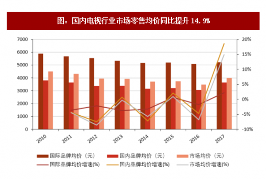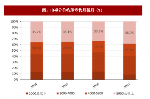 2017年市场销量相对低迷,升级推动价格中枢上移2017年国内电视市场整体呈现低迷态势,根据产业在线数据,2017年电视总销量13425万台,同比下降2.1%,内销量5345万台,同比下降4.8%,外销量8080万台,同比下降0.3%,虽然总体电视市场不尽如人意,但下半年逐渐走出阴霾。此外,行业消费升级趋势明显,创新外观(曲面、超薄、无边框、大尺寸)以及高端显示(8k、hdr、oled、量子点、激光)的市场渗透率有较大提升。其中大尺寸电视占比提升显著,根据中怡康的数据,2017年55’’及以上大尺寸电视零售量份额同比提升11.3个百分点至46.2%;零售额份额同比提升9.7个百分点至67.7%。新技术的发展进一步提高了电视价格中枢水平,2017年电视行业市场零售均价为4002元,同比提升14.9%。其中国内品牌均价为3634元,同比提升18.6%;国际品牌均价为5222元,同比提升2.2%。高价位电视市场占比提升,其中4000-5900元价位段零售量份额占比为17.6%( 3.3pct),5900元 价位段占比为16.0%( 3.8pct);4000-5900元价位段零售额份额占比为21.4%( 1.8pct),5900元 价位段占比为38.0%( 4.5pct)。