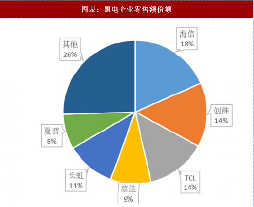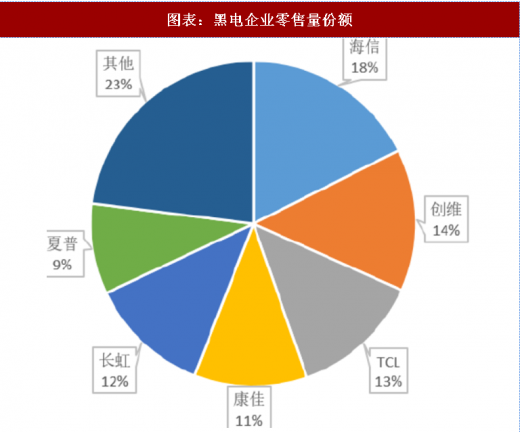 黑电集中度较低,行业整体竞争依然较为激烈。中怡康数据显示,2018年1月,黑电行业前五大品牌,海信、创维、tcl、康佳,长虹的零售量份额分别为18%, 14%,13%, 11%, 12%;零售额份额分别为18%, 14%, 14%, 9%, 11%。