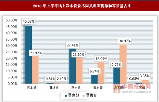 2018年上半年,净水设备线上市场的反渗透产品市场份额持续扩大,零售额市场占比已经达到46.08%。超滤膜产品的零售额市场份额位居第二,零售额市场占比达到20.77%,同比增加46.37%。通常采用反渗透技术的净水机为,反渗透净水机的过滤精度更高,能够过滤掉重金属离子、细菌等杂质,其净化后的水可以直接饮用。所以,在当下“品质消费,健康生活”的趋势下,可以看出消费者更愿意选购反渗透净水设备。